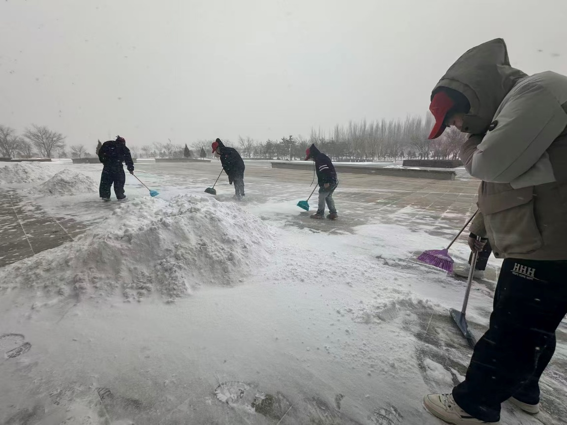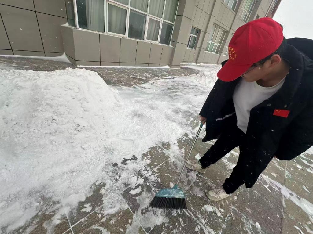 活动当天,志愿者们早早集合,手持扫帚、铁锹等工具,奔赴校园主干道、教学楼出入口及食堂周边等重点区域。尽管寒风凛冽,雪花仍不时飘落,但大家热情高涨、分工协作,有的奋力铲雪,有的仔细清扫,有的合力搬运积雪,忙碌的身影构成了冬日里一道温暖的风景线。从清晨到中午,志愿者们不惧严寒、互相配合,一点点清理着路面的积雪和薄冰,让原本湿滑难行的道路逐渐变得整洁通畅。